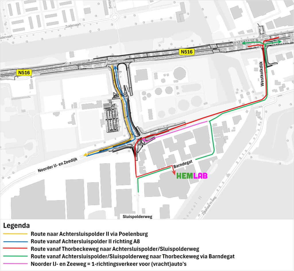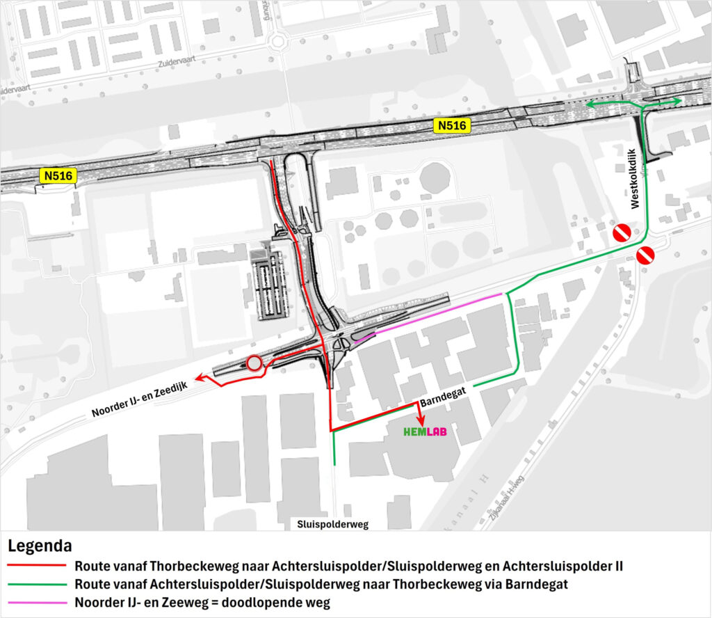 Na 24 oktober 2025 is het Hemlab alleen te bereiken vanaf de Thorbeckenweg (N516) via de nieuwe afslag naar Achtersluispolder/Sluispolderweg. Let op de verkeersborden! Zie rode lijn: