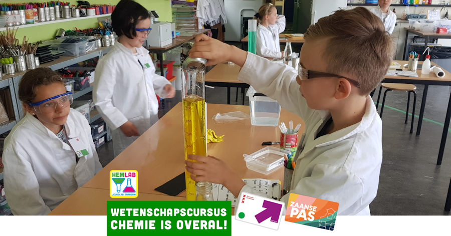 In de wetenschapscursus Chemie is overal! onderzoeken kinderen wat zuren, basen, zouten en zepen zijn. Test je de hardheid van water. Ontdek je waarom melk wit is. Laat je zout kristalliseren, giet je zeep, maak je tandpasta. En onderzoek je hoeveel water er in boter en halvarine zit. En nog veel meer experimenten en plezier. Aan het eind presenteren de kinderen hun leukste en spannende experiment aan ouders, familie en vrienden.